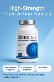 BoneMax delivers a powerful combination of Glucosamine and Chondroitin, two key structural components naturally found in joint cartilage. Supplementing these nutrients helps support the integrity and elasticity of cartilage — the tissue that cushions joints and allows for smooth, comfortable movement. When combined with Vitamin C, which contributes to normal collagen formation for the normal function of cartilage and bones, BoneMax provides comprehensive nutritional support for long-term joint maintenance.